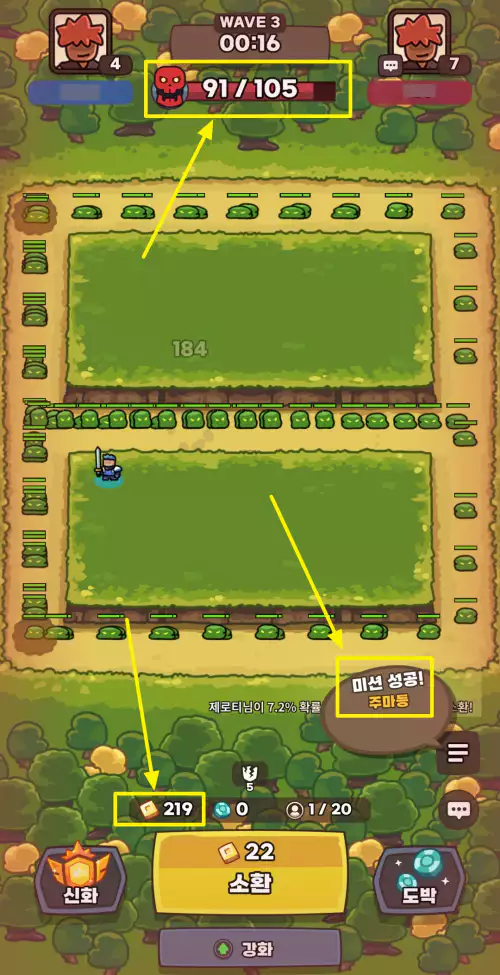 하드모드에서는 운에 크게 좌우됩니다. 한 명이라도 빠르게 전설 또는 신화 유닛을 소환할 수 있다면 게임 진행이 훨씬 수월해집니다. 운이 좋기를 빌며 유닛 소환에 집중하세요.