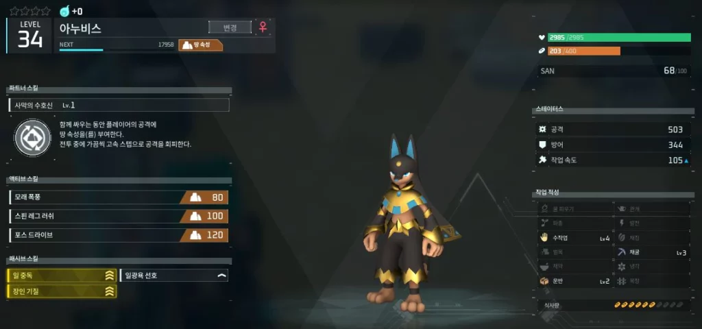 ![]() 아누비스 | 사막의 수호신 함께 싸우는 동안 플레이어의 공격에 땅 속성을(를) 부여한다. 전투 중에 가끔씩 고속 스텝으로 공격을 회피한다. |