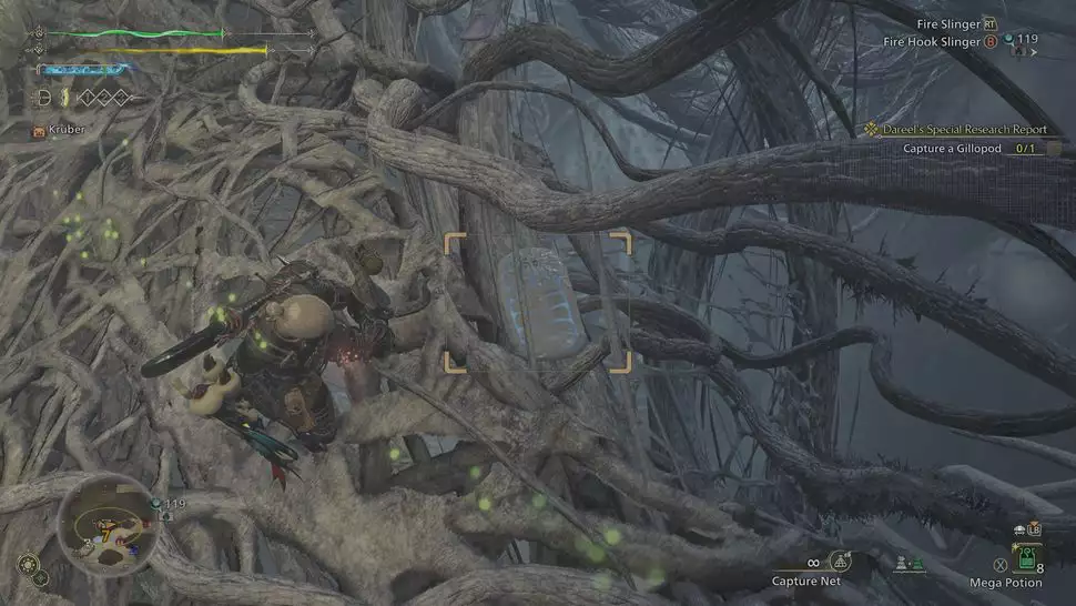 다행히 다리가 없어 도망가지 않으니 컨트롤러의 왼쪽 범퍼를 누른 채 오른쪽 스틱으로 필수 아이템 휠에서 포획용 그물을 선택해 준비하세요. LT를 눌러 조준하고 상자가 주황색으로 변할 때까지 정렬한 다음 RT를 눌러 발사하고 포획하세요. 이 생물이 다릴이 요청하는 마지막 생물이므로, 경계의 모래 평원 베이스캠프로 돌아가 퀘스트를 완료하면 됩니다.
