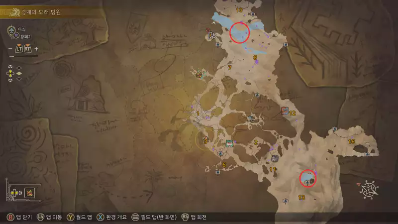 대회복 꿀벌레는 경계의 모래 평원의 10구역과 13구역에서 발견할 수 있습니다. 위 이미지의 빨간색 원은 대회복 꿀벌레가 있을 수 있는 위치입니다.