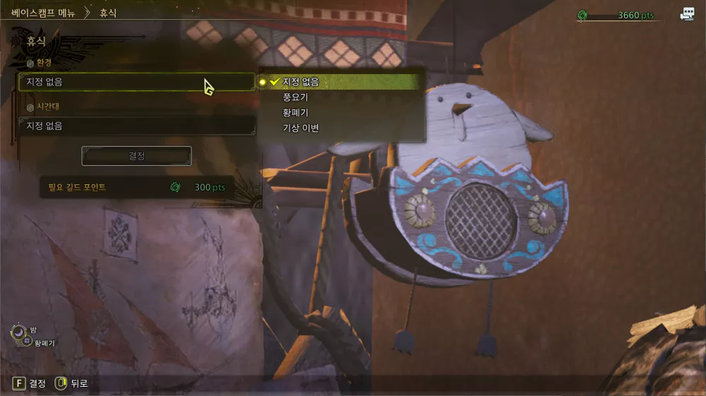 알배기 아미아는 환경이 풍요기일 때만 잡을 수 있습니다. 현재 위치의 환경을 변경하려면 모든 캠프에서 텐트 안으로 들어가 휴식하고 환경 옵션에서 풍요기 상태를 선택해야 합니다.