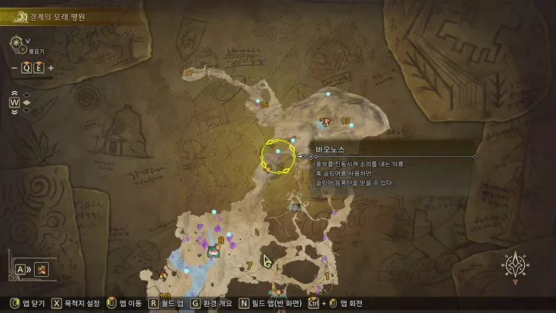 익룡의 가죽을 파밍할 수 있는 지역은 경계의 모래 평원입니다, 바오노스가 스폰될 수 있는 지역이 여러 곳 있기 때문입니다. 위는 이 몬스터가 스폰될 가능성이 가장 높은 위치를 나타내는 마커가 표시된 지도입니다.