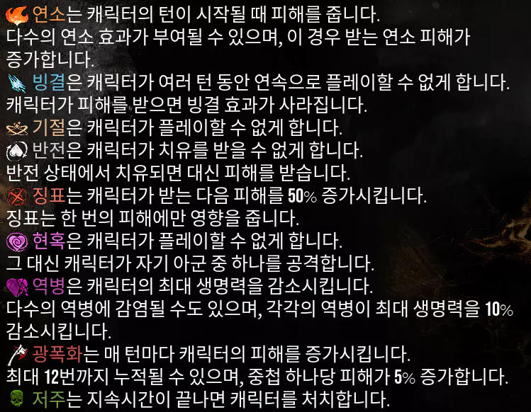 - 역병은 캐릭터의 최대 생명력을 10%씩 감소시키는 효과로, 여러 번 감염될 경우 생존 자체가 어려워집니다.