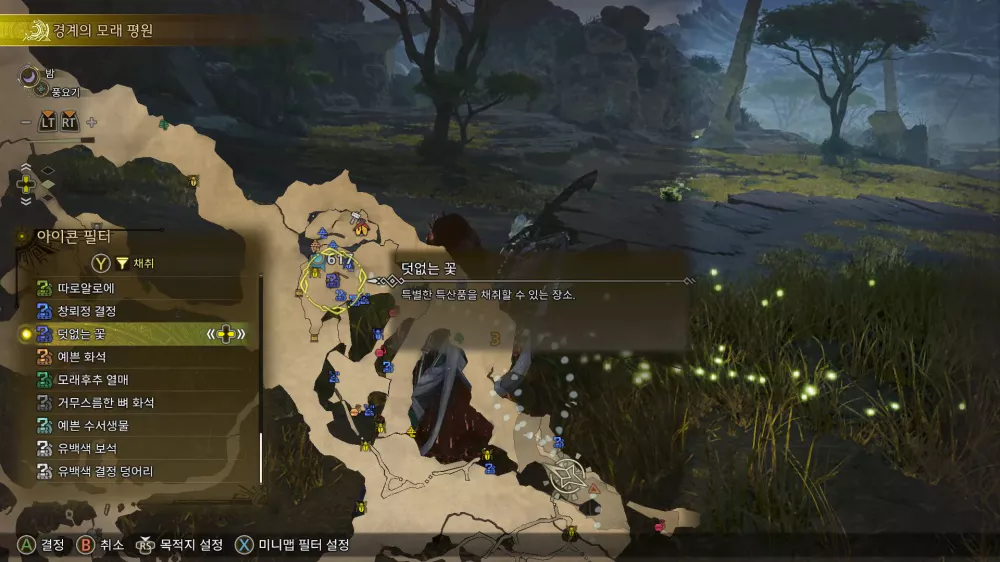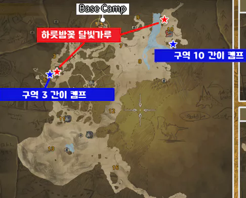 예방 차원에서 경계의 모래 평원 3구역과 10구역에 간이 캠프를 설치하세요. 이렇게 하면 하룻밤꽃의 달빛가루 파밍 시 두 캠프 사이를 빠르게 이동할 수 있습니다.
