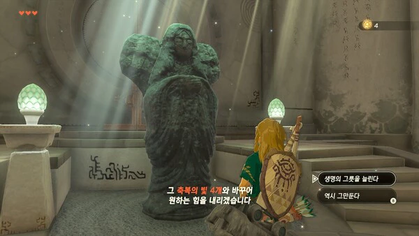 생명의의 그릇과 스태미나 그릇을 늘리는 주된 방법은 사당을 클리어하면 얻을 수 있는 ‘축복의 빛’을 여신상에 봉헌하는 것이다. 맵에 흩어져 있는 사당을 클리어하여 여신상까지 가져가자.