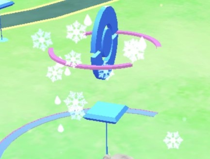 아이스 루어의 효과는 눈의 결정이 춤추고있는 것이 특징. 이런 효과를 보면 아이스 루어가 포켓 스톱에 꽂혀있다.