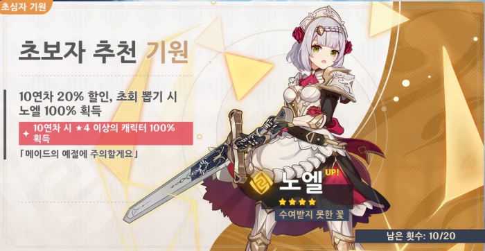 | ■ 초회 10연뽑기로 ★4 노엘을 반드시 획득 ■ 다음의 10뽑기로 ★4이상의 캐릭터가 1명 확정 ■ ★4이상은 캐릭터만 출현(20% 할인) ■ 20회까지밖에 뽑을 수 없다(기한은 없음) |