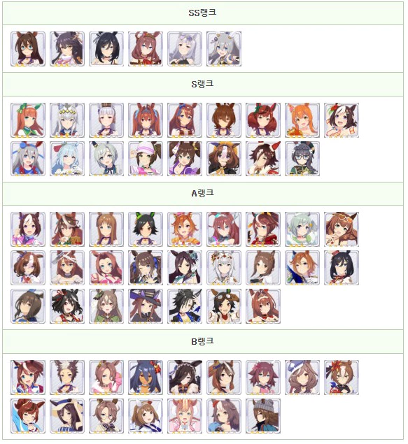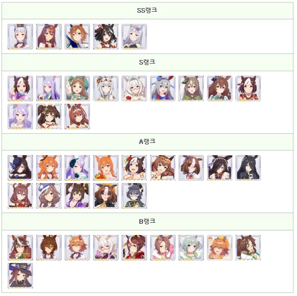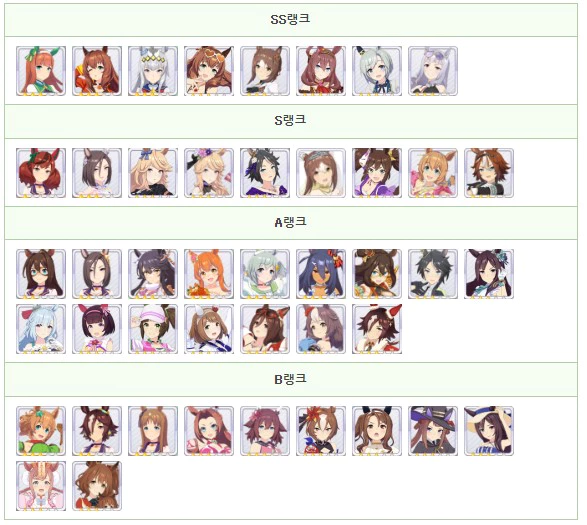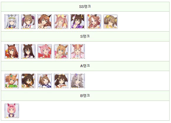 우마무스메에 있어서의 육성 우마무스메의 최강 캐릭터 평가를 SS ~ B 등급 형식으로 게재. 단거리, 마일, 중거리, 장거리, 다트와 적성별 평가나 팀 경기장의 사용률을 정리하고 있으므로, 최강 우마무스메의 육성을 목표로 할 때의 참고하시기바랍니다.