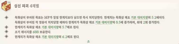 후반으로 접어들면 에디가 메인 딜러로 자주 사용됩니다. 에디의 궁극기는 특정 적에게 독화살을 부여하여 지속적인 피해를 입히며, 체력이 낮은 적을 빠르게 처리할 수 있습니다. 독화살은 제거가 불가능하며, 에디가 전투 중 사망하더라도 독화살은 그대로 남아 즉사 효과를 발휘합니다.